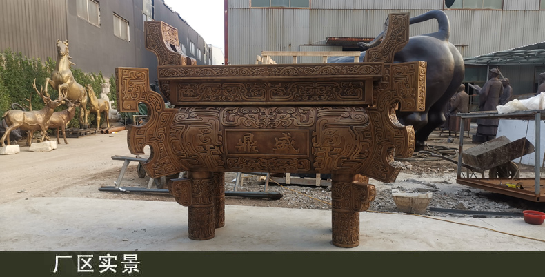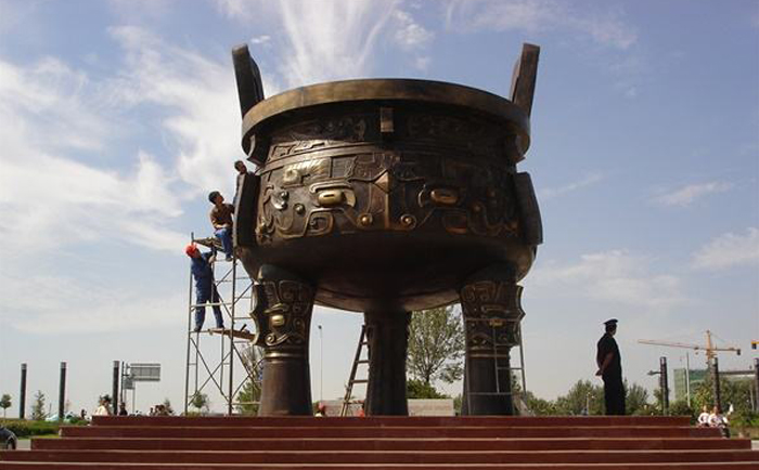 大型銅鼎雕塑是我國青銅文化時(shí)期的代表,鼎在古代被視為立國重器,是權(quán)力的象征。直到現(xiàn)在,人們?nèi)匀挥幸环N鼎崇拜的意識,“鼎”字也被賦予“顯赫”、“ 尊貴”、“盛大”等引申意義,如:一言九鼎、大名鼎鼎、鼎盛時(shí)期、鼎力相助,等等。鼎又是旌功記績的禮器,周代的國君或王公大臣在重大慶典或接受賞賜時(shí)都要鑄鼎,以旌表功績,記載盛況。